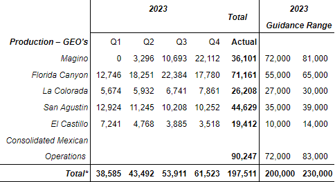 In summary, the Company nearly achieved consolidated lower end of production guidance, with strong performances from Florida Canyon and the Mexican operations, offset by lower than expected output from Magino.