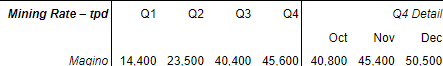 - With additional mobile equipment scheduled to arrive in H1 2024 along with the installation of the fleet management system, management expects daily mining rates to increase into the 65,000 tpd range in 2024, in line with the current NI 43-101 technical report for the Magino Mine.
