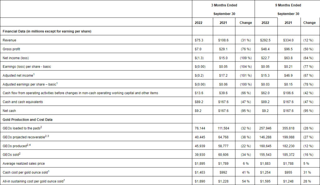 TORONTO, Nov. 3, 2022 /CNW/ – Argonaut Gold Inc. (TSX: AR) (the “Company”, “Argonaut Gold” or “Argonaut”) is pleased to announce today its operating and financial results for the third quarter ended September 30, 2022. For the third quarter 2022, the Company reports production of 45,939 gold equivalent ounces (“GEO” or “GEOs”2), revenue of $75.3 million, cash flow from operating activities before changes in non-cash working capital and other items of $13.6 million, net loss of $1.3 million or loss per share of $0.00, and adjusted net loss3 of $0.2 million or adjusted loss per share3 of $0.00. All dollar amounts are expressed in United States dollars, unless otherwise specified (C$ refers to Canadian dollars).