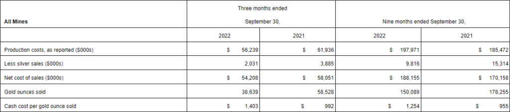 The Company sold fewer ounces than it produced in the third quarter 2022 due to timing of gold sales. Those ounces in finished goods inventory were sold in October 2022. The average realized gold price was $1,895 per gold ounce as compared with the average price of $1,728 for the third quarter 2022. This higher price was realized by delivering into the gold forward pricing contracts for the quarter and into future forward contracts.