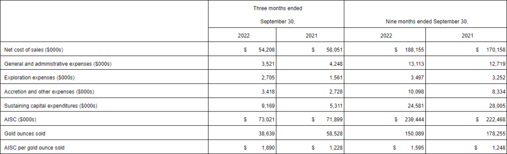AISC includes net cost of sales at the Company’s mining operations, which forms the basis of the Company’s cash cost per gold ounce sold. Additionally, the Company includes general and administrative, exploration, accretion and other expenses, and sustaining capital expenditures. Sustaining capital expenditures exclude all expenditures at the Company’s pre-production, development stage, and advanced exploration stage projects and certain expenditures at the Company’s operating sites that are deemed expansionary in nature.