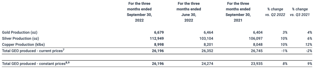 Preliminary GEO production volume for the three months ended September 30, 2022, when compared to the previous quarter and the same period of 2021 is shown below: