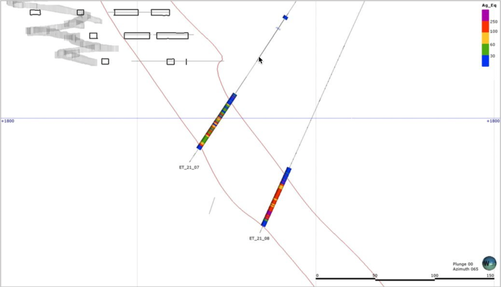 - Hole Number – ET 21-08: 226 AgEq g/t over 30 metres, including 617 AgEq g/t over 0.65 metres.