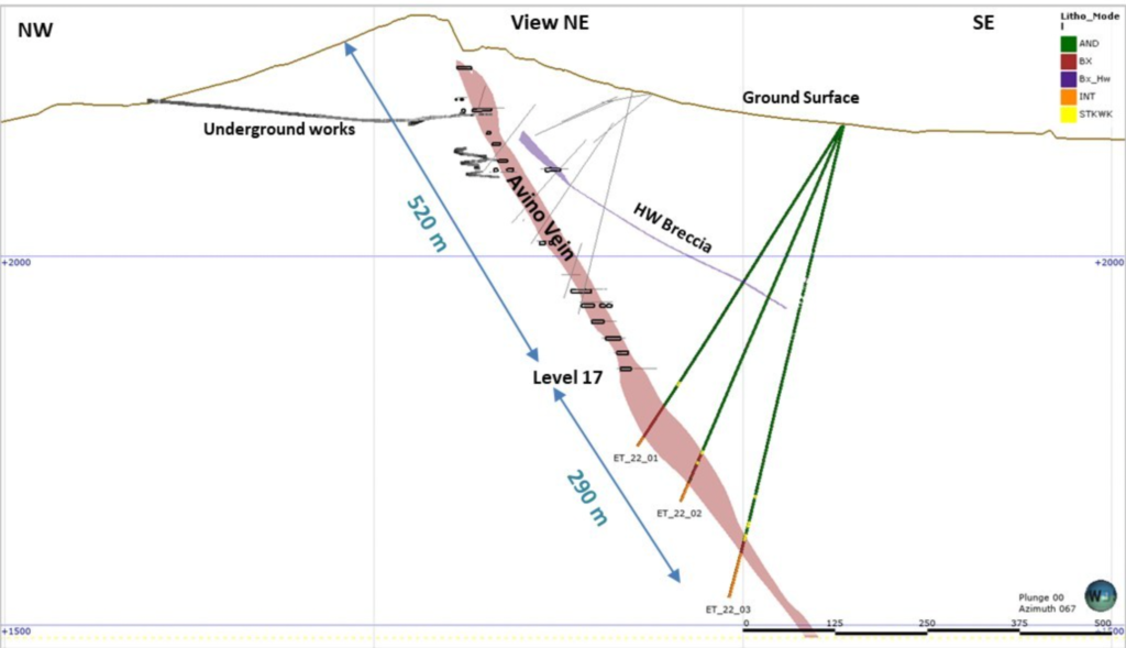 Vein-type mineralization and stockwork with mineralization of Au, Ag, and Cu are found along the contacts between intrusive rock and an andesite and provide opportunities within the ET Area for the identification and delineation of additional mineral resources that remain open on strike and dip (see Figure 1 for the projections of the resource relative to the drilled holes). The Inclined distance of the Avino vein at the ET Mine from surface is approximately 520 metres as shown in figure 3. This recent deeper drilling suggests that the mineralization persists down dip for an additional 290 metres past the lowest developed mining level. Currently, the mine levels have a vertical separation of 20 metres, suggesting a potential further 14 additional underground levels may be required (depending on economic conditions) to mine the mineralization. Highlights