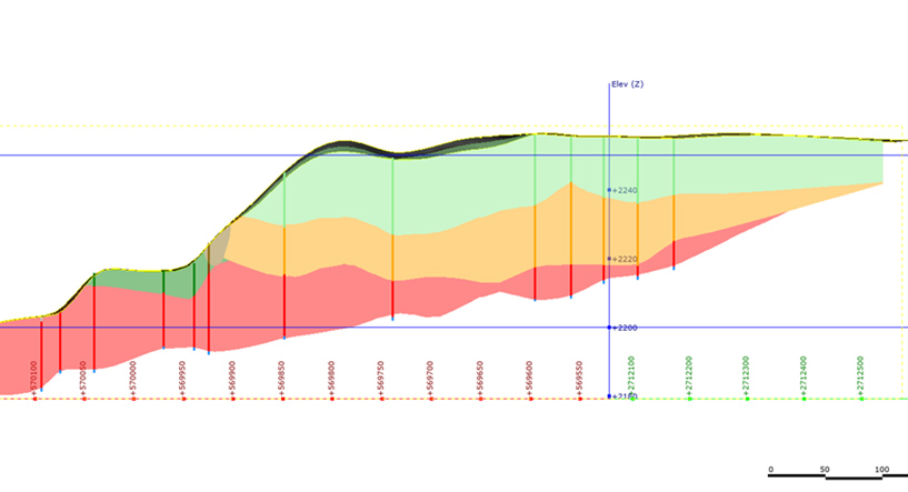 The tailings were drilled with a 2″ sonic drill, which was drilled to the underlying bedrock. The use of the sonic drilling technique provides high quality information and representative granulometry and grade samples. The bedrock is sloped so that the depth of each hole can vary significantly depending on the drill hole location. The presented drill results detail the depth and assay values of each layer of tailings, noting that many of the holes penetrated more than one layer of tailings. The figures below show the drill holes in plan view as well as the longitudinal section that shows the depth of each layer of tailings.