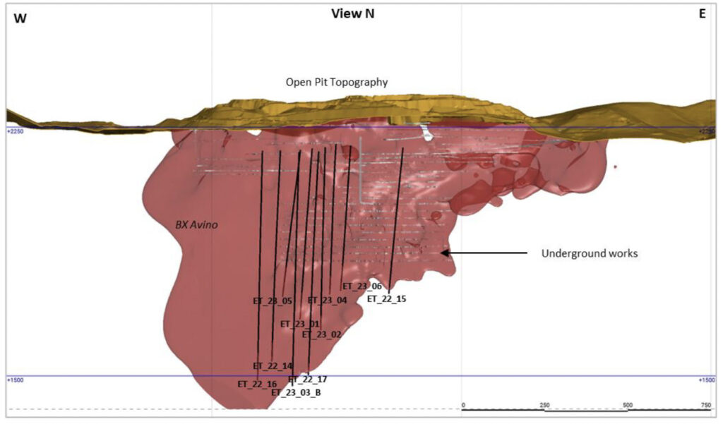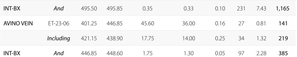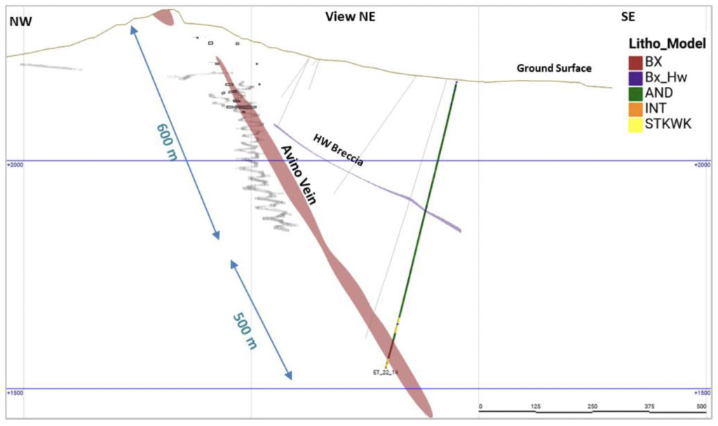 VANCOUVER, BC, May 23, 2023 /CNW/ – Avino Silver & Gold Mines Ltd. (TSX: ASM) (NYSE: ASM) (FSE: GV6), (“Avino” or “the Company”) releases the results of ten drill holes from below Level 17, the current deepest workings of the mine. The current drill campaign has extended our knowledge of the continuity of the Avino Vein to a distance of 500 meters downdip of the lowest mining level. The exploration program is designed to test the continuity and to improve our understanding of the potential for deeper mineralization. The extent of the Avino Vein has been established to be at least 1,100 metres downdip from surface outcrop. Additionally, a previously undiscovered breccia vein was intersected approximately 15 to 30 metres below the Avino Vein in the footwall intrusive rocks. This unit has revealed three good intercepts (labelled INT-BX in Table 1) including a 35 cm intercept in ET-23-05 yielding 1,165 AgEq g/t. These intercepts warrant further follow-up to see if it can be correlated with historic intercepts in the footwall of the Avino Vein to determine potential continuity.
