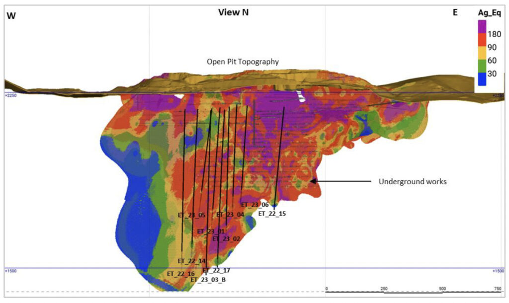 - Hole ET 23-04: 122 AgEq g/t (including 0.65% Cu) over 35.73 metres true width, including 208 AgEq g/t (including 1.33% Cu) over 5.20 metres true width, as well as 152 AgEq g/t (including 0.82% Cu) over 6.24 metres true width