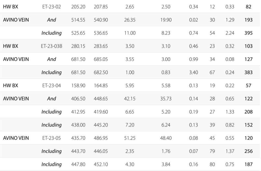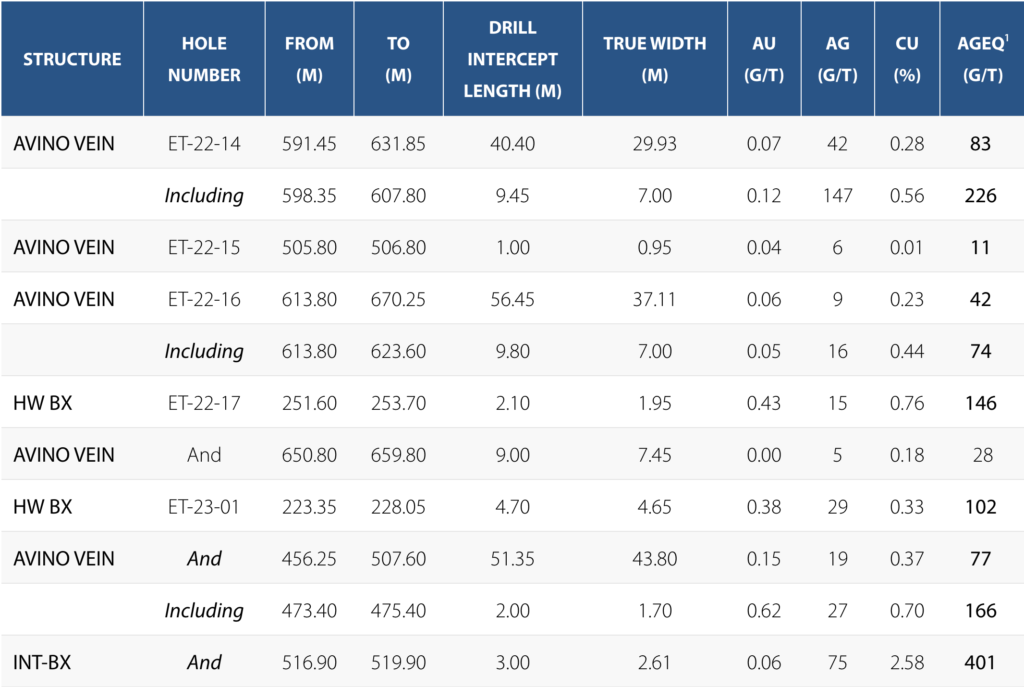 “The ET area drilling builds on results from our 2022 drill program as well as the January 2023 drill results as we continue to extend the area of mineralization below Level 17,” said David Wolfin, President and CEO. “We drilled 500 metres below our current mine workings to confirm the continuity of mineralization. As we have come to expect with the Avino Vein, the drill intercept widths suggest that this area will be able to be mined by our existing low-cost bulk methods. In addition, we were delighted to discover a new veinlet within the footwall intrusive rock that was very high grade. We include both step out and infill drilling in this campaign and these new step-out holes are obviously not included in the most recent mineral resource estimate released earlier this year.”
