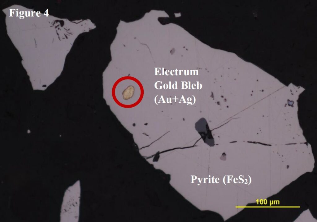 Finally, reflected light microscope imaging of sample 8 discovered a native gold particle in the form of electrum, see Figure 4. This identified electrum bleb is located within a pyrite crystal, and its existence signifies the presence of native gold within the Metates system, which is in addition to the gold known to be within the sulphide minerals.