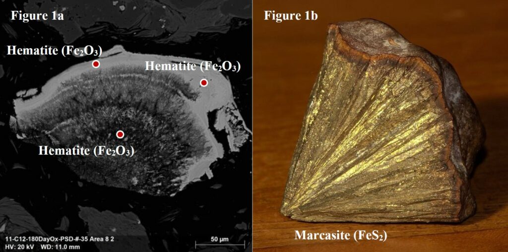 The mineralogical work identified several examples where the alkaline solution(s) had actively oxidized and transformed the sulphide minerals present within the Metates host rocks. Microprobe imaging of sample 11 in Figure 1a shows an example of an iron sulphide marcasite mineral (another form of pyrite) that has been altered completely from its original chemistry, but the radial form of the mineral remains intact. The sulphur content within this mineral has been stripped away and replaced by oxygen, forming hematite, the same iron oxide that forms when iron rusts. An example of an unaltered marcasite mineral is illustrated in Figure 1b for reference1, evidencing the same radial growth of the crystals.