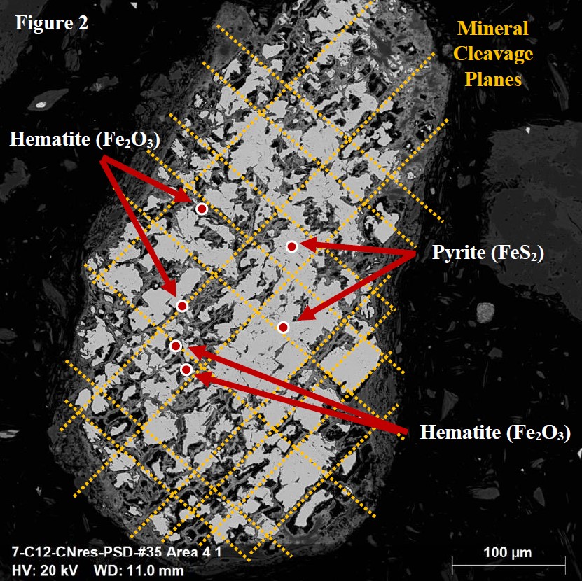Microprobe imaging of sample 7 in Figure 2 captures an example of another iron sulphide mineral that was once pyrite, which is in the process of altering to hematite or limonite. This image shows the process of preferential mineral oxidation that has followed along the cleavage planes (structural fractures) of the mineral. Along these cleavage planes the sulphur from the pyrite has been stripped away and replaced with oxygen, transforming these regions into iron oxides, whereas in the centers, there are small core remnants of the original pyrite crystal.