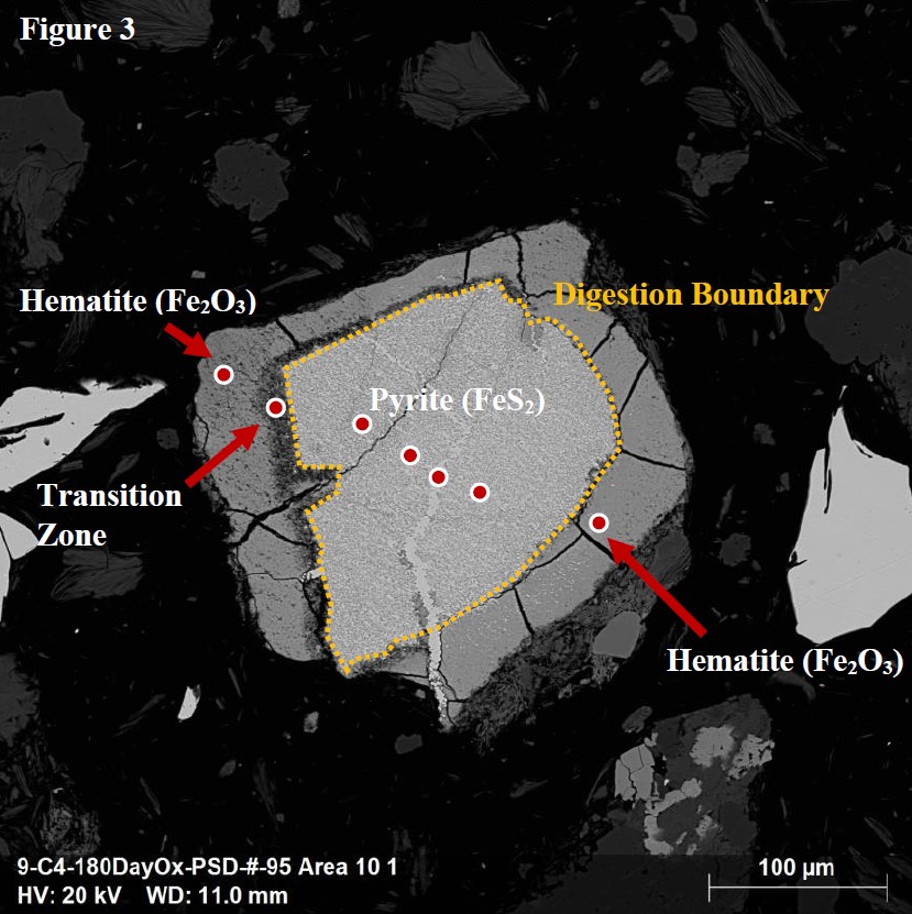 Microprobe imaging of sample 9 in Figure 3 provides another example of the oxidation of an iron sulphide mineral that was once pyrite, now altering to hematite or limonite. This image captures the periphery of the pyrite mineral being oxidized first, and a transition zone and digestion boundary are clearly demarcated, creating a notable zonation.