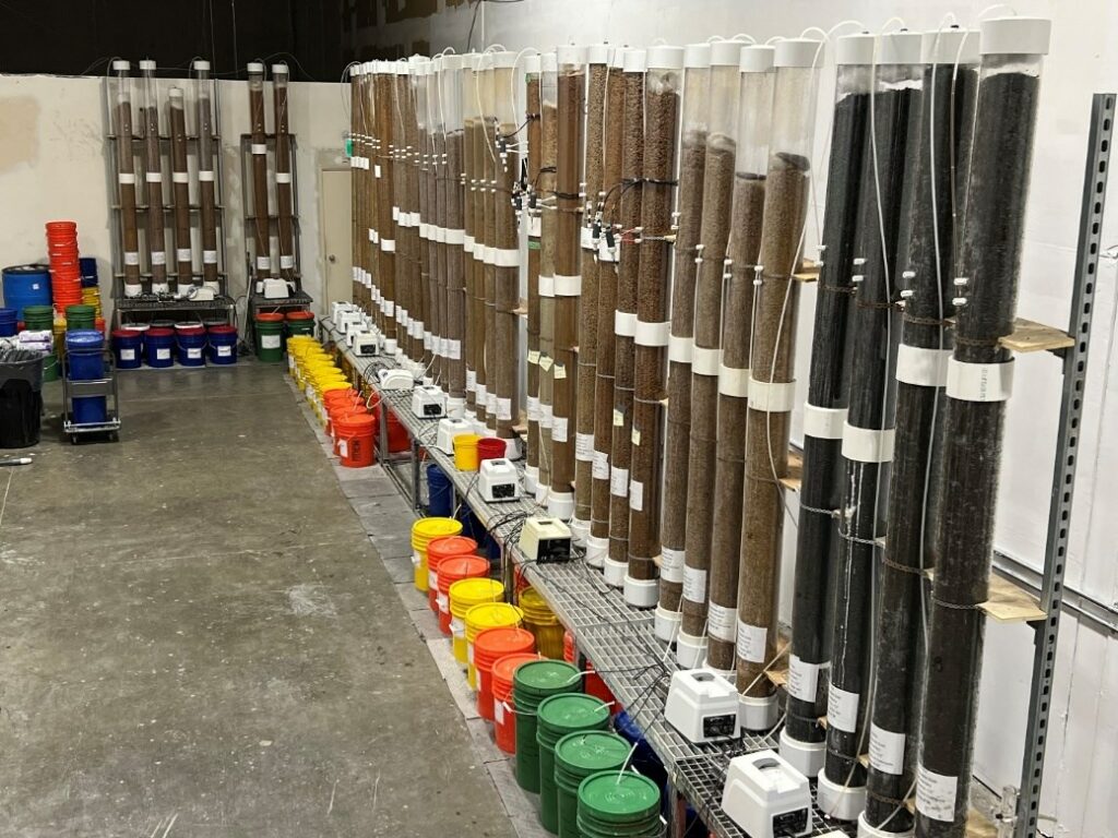 The parameters tested during this stage of work include: (i) finer crushing sizes from ½” to ⅜” to ¼” and the use of High Pressure Grinding Rolls (“HPGR“) to produce a very fine crush at approximately 3mm; (ii) varying reagent strengths; (iii) targeting different pH’s; (iv) testing on/off irrigation; (v) applying other oxidants; and (vi) varying air injection rates. As illustrated in the lab photo above, over 40 columns are currently under oxidation or cyanide leach.