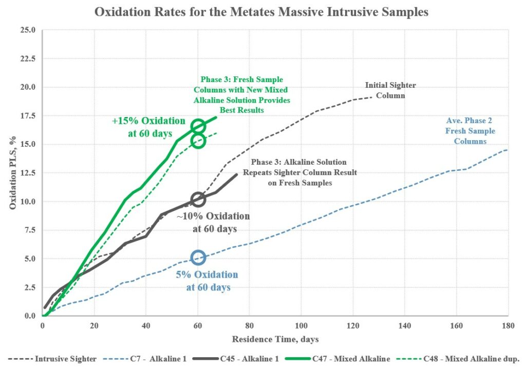 The above graph illustrates the oxidation rates for the Metates massive intrusive samples and highlights the improved oxidation rates relative to previously released column results. The new conditions are showing very encouraging oxidation rates, the Phase 3 columns have achieved an oxidation level of 15% to 16% in just 60 days, which when compared to the initial sighter column is 50% faster and for the Phase 2 columns over 300% faster. These Phase 3 columns will be transitioned to cyanide leach once they achieve the target oxidation above 35%.