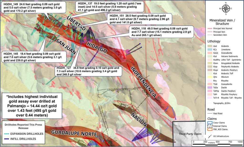 - Hole HGDH_137 (Hidalgo) returned 19.0 feet at 1.20 oz/t gold and 14.5 oz/t silver (5.8 meters at 41.1 g/t gold and 496.2 g/t silver)