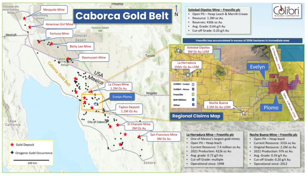 The EP Gold Project is located within the Caborca Gold Belt (“CGB”) of northwestern Sonora and is comprised of the Evelyn and the Plomo properties covering a total of 4,766 hectares (“Ha”). The northwest trending CGB is approximately 500 km in length and is characterized by a number of orogenic-type gold deposits, prospects, and occurrences including the > 15 million ounce La Herradura Mine, located 25 km west of EP, the > 2-million-ounce Noche Buena Mine located approximately 8 km southwest of EP, and the past producing Soledad-Dipolos Mine (> 3 Moz Au) located approximately 32 km to the northwest of EP (see figure 4).