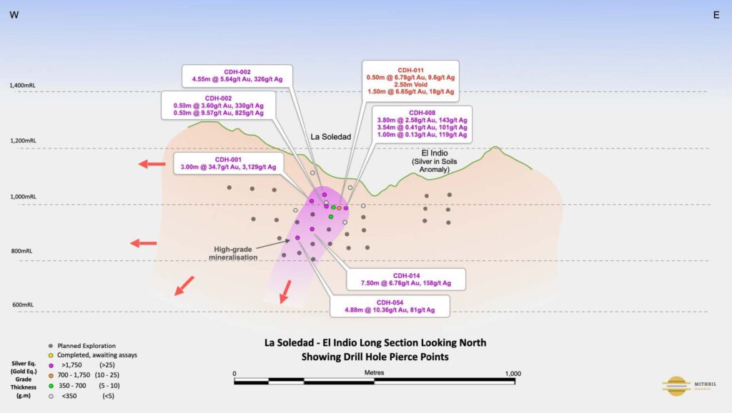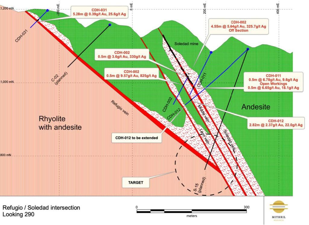 - Drilling at Cometa has focused on the shallow mineralised zone explored by Bell Coast Capital and UC Resources from the late 1990’s to the early 2000’s. Mithril’s next pass drilling will include a twin of an historic drill hole and will step down dip to infill between holes CDH-061 7.75m @ 0.95 g/t gold, 24.7 g/t silver from 272m and CDH-027 11.7m @ 1.16 g/t gold, 70 g/t silver from 10.9m.