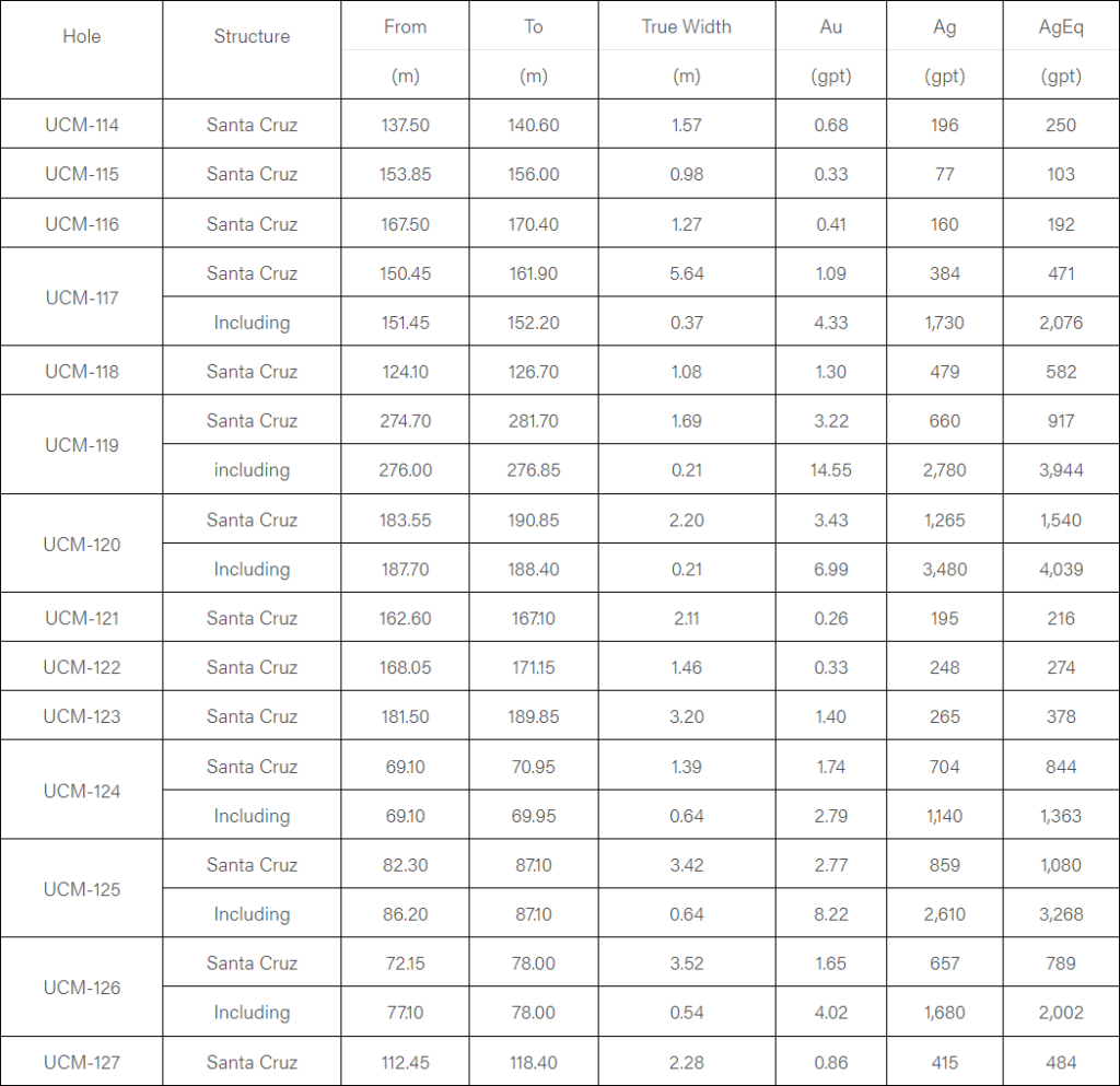 - 2.77 gpt Au and 859 gpt Ag for 1,080 gpt AgEq over a 3.4 m ETW, including 8.22 gpt Au and 2,610 Ag for 3,268 gpt AgEq (UCM-125)