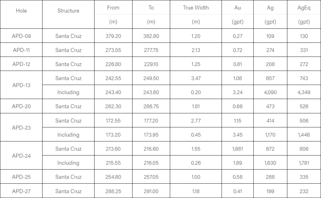 - 1.08 gpt Au and 657 gpt Ag for 743 gpt AgEq over a 3.5 m ETW, including 3.24 gpt Au and 4,090 Ag for 4,349 gpt AgEq (APD-13)