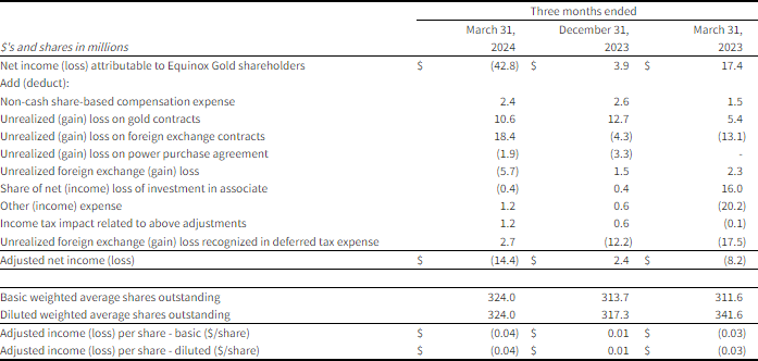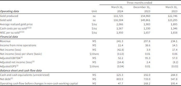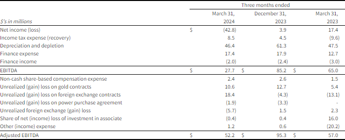 In Q1 2024, adjusted EBITDA was $52.2 million (Q1 2023 – $57.0 million). In Q1 2024, adjusted net loss was $14.4 million (Q1 2023 – $8.2 million). The decrease in adjusted EBITDA and increase in adjusted net loss was primarily due to lower income from mine operations, a higher realized loss on foreign exchange and higher general and administrative expense compared to Q1 2023, offset partially by the impact of a $14.3 million realized gain on foreign exchange contracts in Q1 2024 compared to a realized gain of $5.4 million in Q1 2023. The increase in the adjusted net loss between periods was also due to higher finance expense compared to Q1 2023.