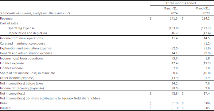 The net loss for Q1 2024 was $42.8 million (Q1 2023 – net income of $17.4 million). The net loss in Q1 2024 compared to net income in Q1 2023 was primarily due to other expense of $13.9 million in Q1 2024 compared to other income of $31.9 million in Q1 2023, in addition to lower income from mine operations and higher general and administrative and finance expense compared to Q1 2023 (refer to Financial Results section). Other expense in Q1 2024 was primarily due to a $11.6 million loss on the change in fair value of gold contracts as a result of an increase in average forward gold prices during the Quarter. Other income in Q1 2023 was primarily due to a $34.5 million gain on sale of the Company’s partial interest and reclassification of investment in i-80 Gold Corp.