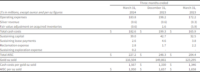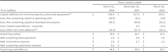 Sustaining and non-sustaining expenditures totaled $44.6 million and $69.3 million, respectively, for the three months ended March 31, 2024. Sustaining and non-sustaining expenditures are broken down by mine site in the MD&A.