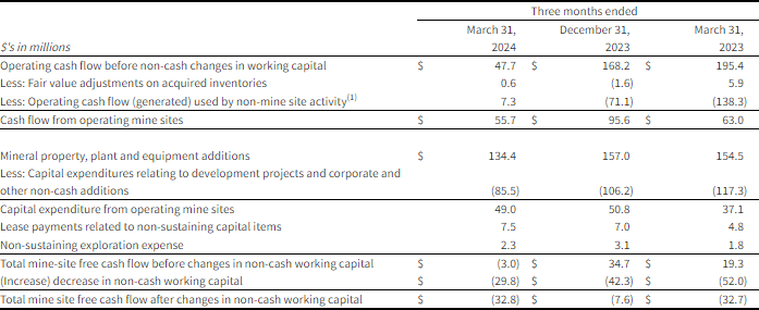 In Q4 2023, the Company revised the calculation to include changes in non-cash working capital and present mine-site free cash flow after changes in non-cash working capital. The Company believes it is useful to provide mine-site free cash flow before and after changes in non-cash working capital as working capital can fluctuate significantly between periods due to numerous factors.