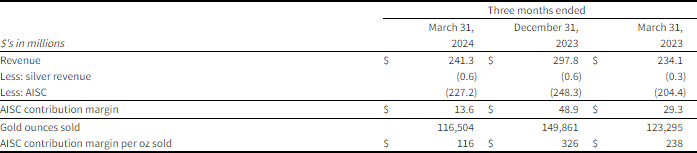 Revenue was higher in Q1 2024 compared to Q1 2023 primarily due to a 9% increase in realized gold prices, offset partially by a decrease in gold ounces sold. The Company realized $2,066 per ounce sold in Q1 2024 generating $241.3 million in revenue, compared to $1,895 per ounce sold in Q1 2023 generating $234.1 million in revenue.