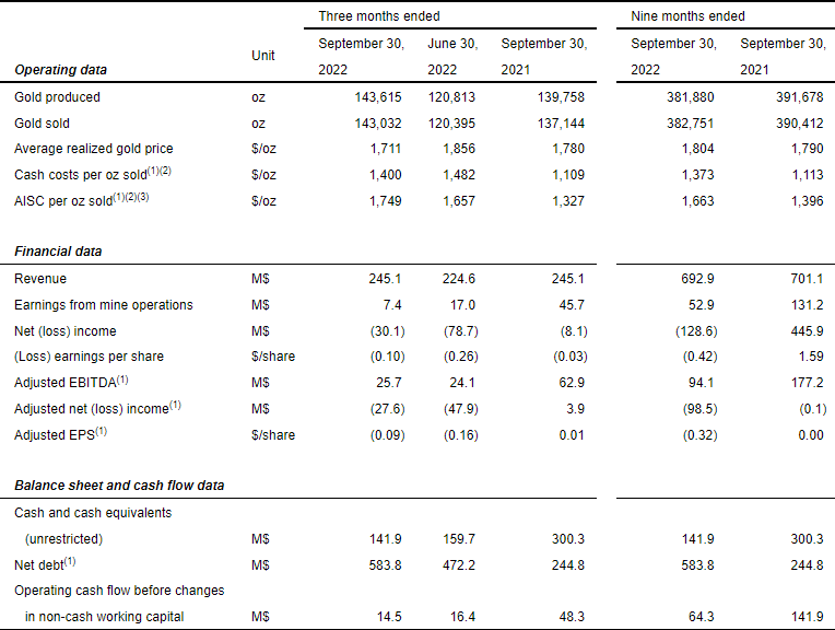 In Q3 2022, adjusted EBITDA was $25.7 million (Q3 2021 – $62.9 million) and for the nine months ended September 30, 2022 was $94.1 million (nine months ended September 30, 2021 – $177.2 million). In Q3 2022, adjusted net loss was $27.6 million (Q3 2021 – adjusted net income of $3.9 million) and for the nine months ended September 30, 2022 was a net loss of $98.5 million (nine months ended September 30, 2021 – adjusted net loss of $0.1 million). Adjusted EBITDA and adjusted net loss were impacted by lower earnings from mine operations compared to the comparative periods in 2021.