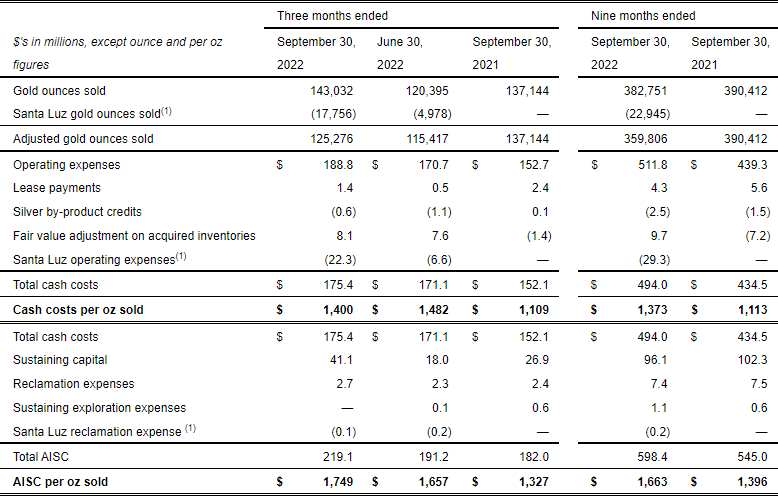 (2) Consolidated cash cost per oz sold and AISC per oz sold for the three and nine months ended September 30, 2022 exclude Santa Luz results as the mine was in pre-commercial production up until the achievement of commercial production at the end of Q3 2022.