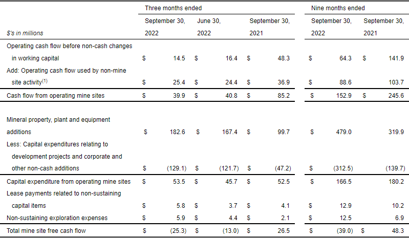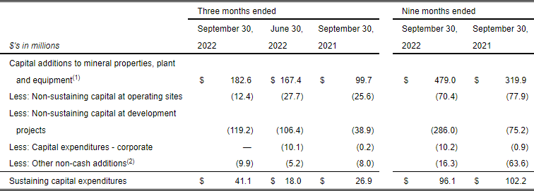 Sustaining capital expenditures totaled $41.1 and $96.1 million for the three and nine months ended September 30, 2022, respectively. Non-sustaining capital expenditures totaled $131.5 million and $356.4 million for the three and nine months ended September 30, 2022, respectively. Sustaining capital and non-sustaining capital expenditures are broken down by mine site in the MD&A.