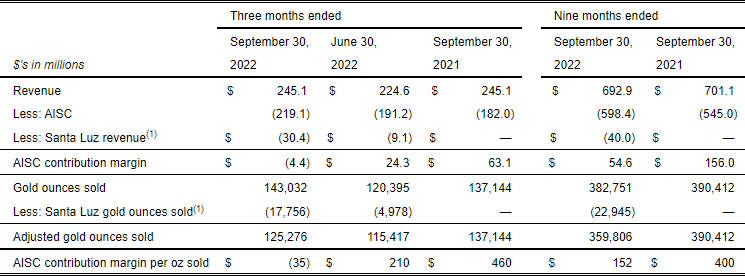 (1) AISC contribution margin for three and nine months ended September 30, 2022 excludes Santa Luz results as the mine was in pre-commercial production up until the achievement of commercial production at the end of Q3 2022.