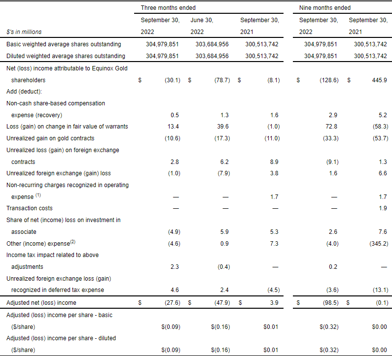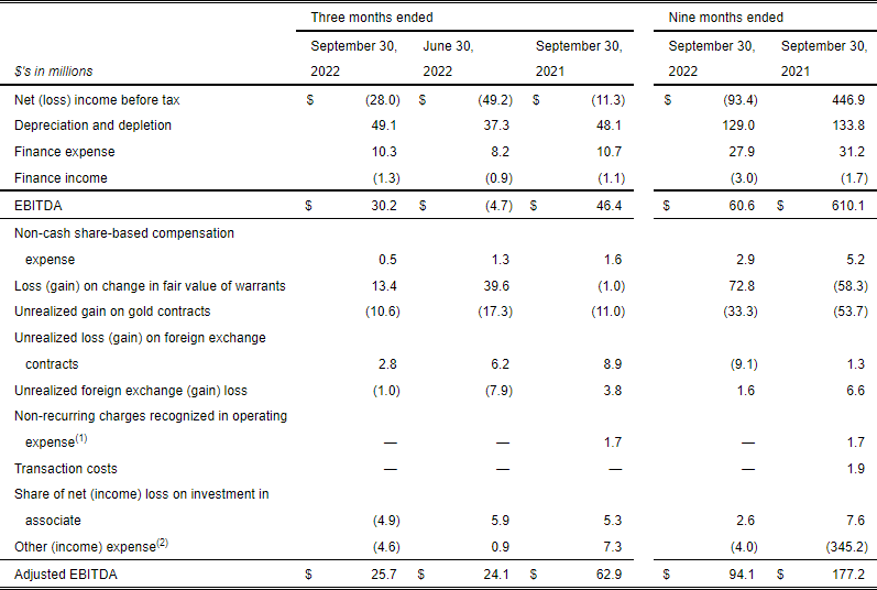 (3) Primary adjustments for the three months ended September 30, 2022 were a $13.4 million loss on change in fair value of share purchase warrants and a $10.6 million unrealized gain on gold contracts.