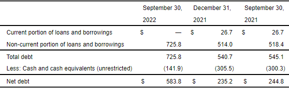 - Cash and cash equivalents (unrestricted) of $141.9 million at September 30, 2022