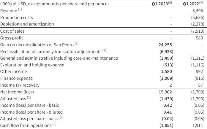 (5) Production ceased and the Platosa mine and Miguel Auza mill were placed on care and maintenance in early Q4 2022. As a result, no revenue, production costs and gross profit were recorded in Q1 2023.