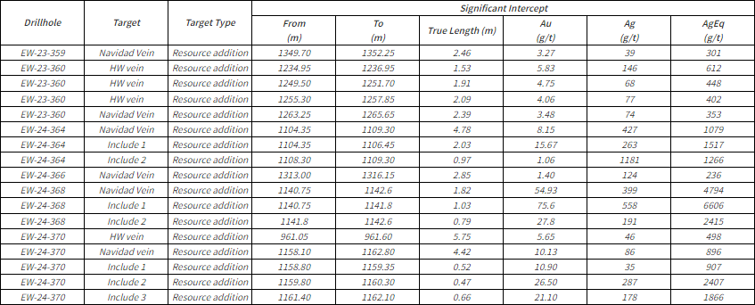 - EW-24-364: 8.15 g/t Au and 427 g/t Ag over 4.78 metres (“m”) true thickness (Navidad Vein)