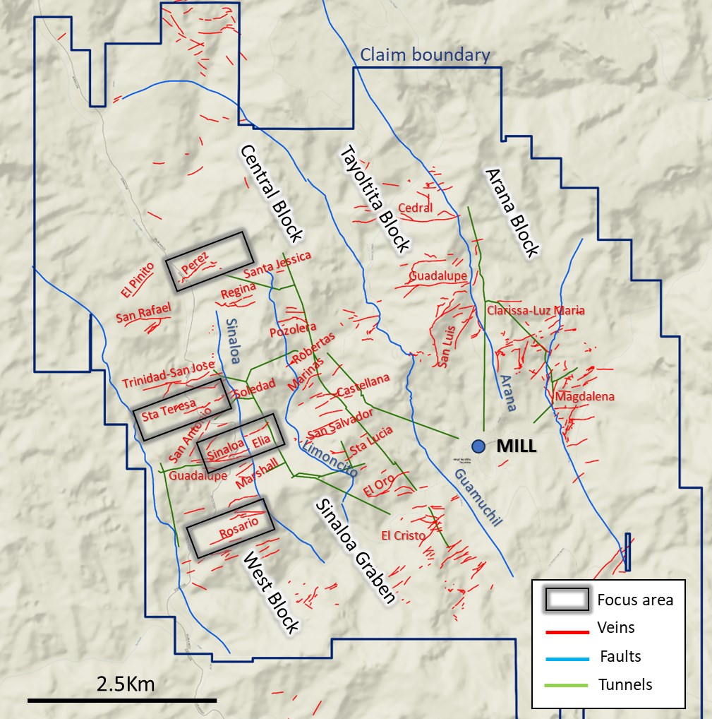 Exploration drill holes at the San Dimas property intersected significant gold and silver mineralization in multiple veins. Four areas are highlighted here: Sinaloa North-Elia, Santa Teresa, Rosario and Perez (Figure 1).