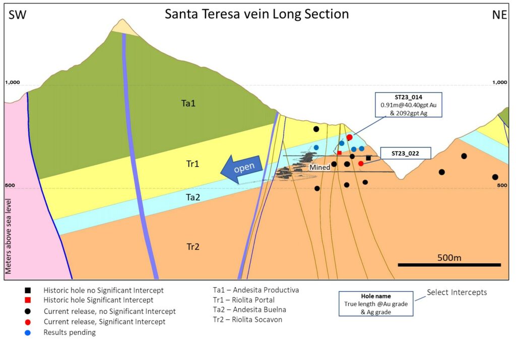 Expansionary drilling on the projection of the historic Santa Teresa vein has returned significant intercepts. The vein remains undrilled to the west for ~500m along strike for exploration upside (Figure 3). Drill hole assay grade and intervals (true width) of the vein intersections are shown below:
