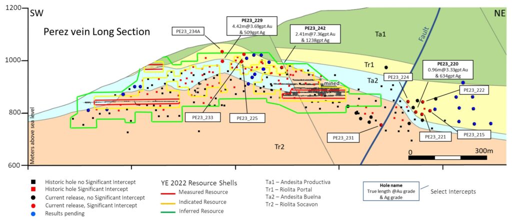 - Hole PE23-229: 3.69 g/t Au & 509 g/t Ag over 4.42m;
