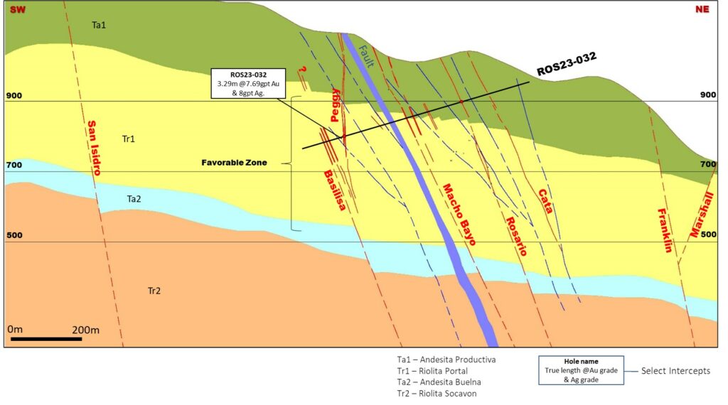 - Hole RO23_032: 7.69 g/t Au & 8g/t Ag, 3.29 m (Peggy vein)