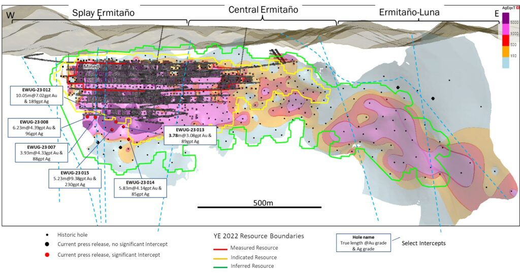 - Hole EWUG-23-015: 9.38 g/t Au & 230 g/t Ag over 5.23m;