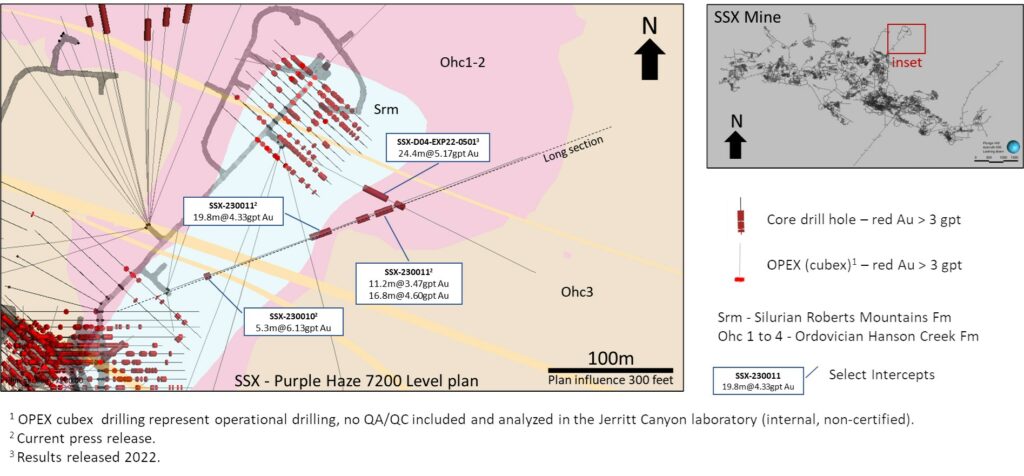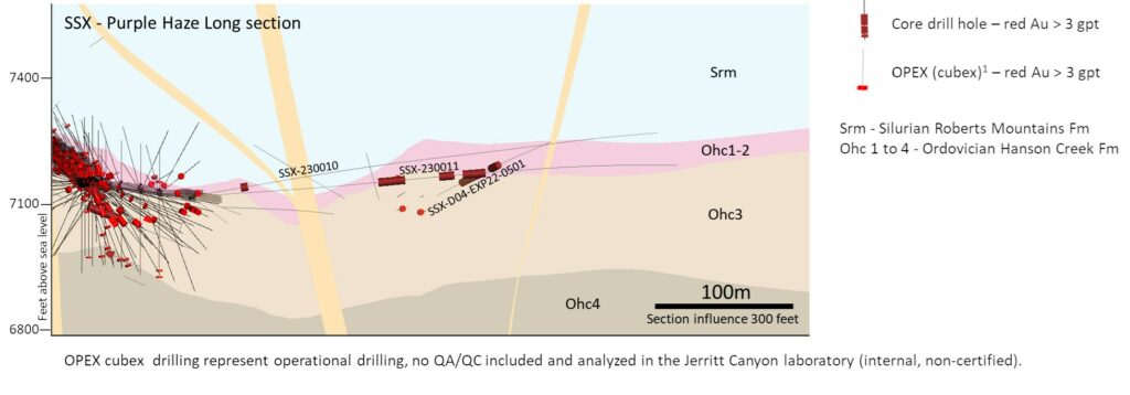 Drilling of the Purple Haze exploration target intersected new gold mineralization located up to 100m away from existing developments of the SSX mine. The geometry and controls of the gold mineralization are interpreted to trend at a relatively low angle to the drill hole intersections as shown in Figure 11 and Figure 12. Mineralization remains open in multiple directions.