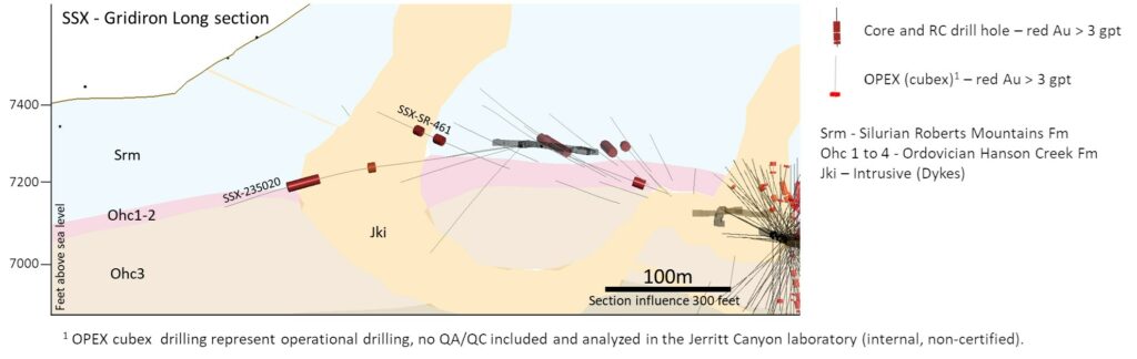Exploration drilling designed to test prospective geologic features in the Gridiron target cut two significant gold intercepts located approximately 80 and 120m away from existing SSX mine development. The mineralization is hosted adjacent to a Jurassic dike cutting the base of the Silurian Roberts Mountain Formation. The geometry of the gold mineralization is not yet defined, and the mineralization is open in several directions (Figure 13 and Figure 14).