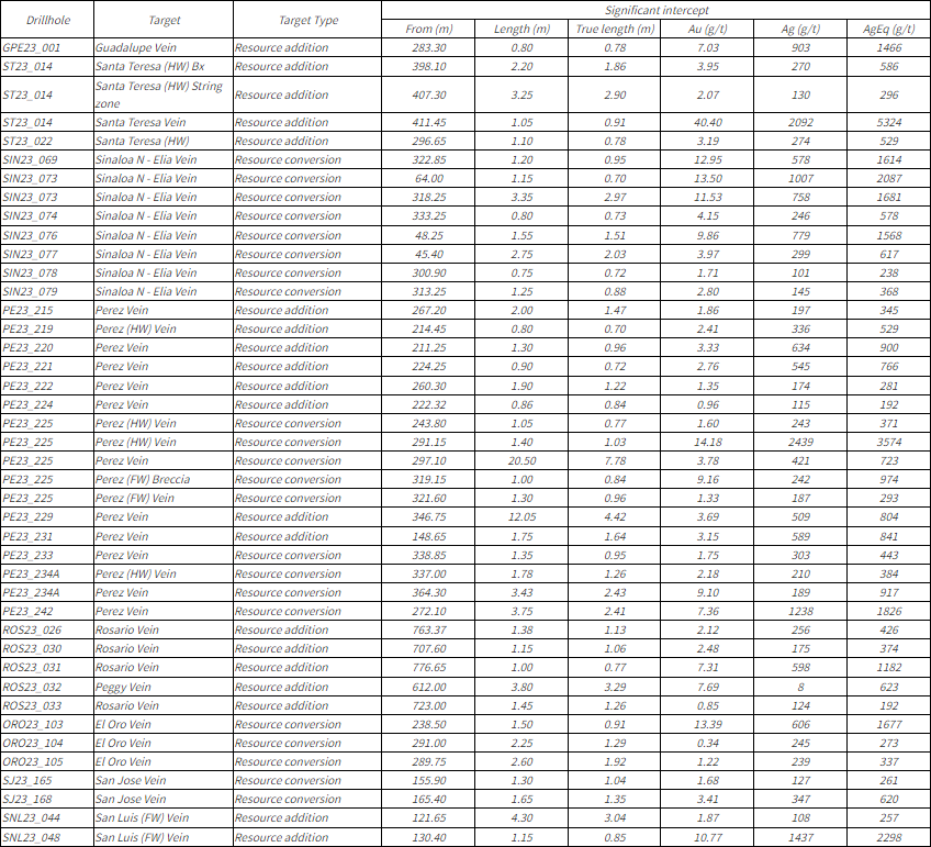 “We are very encouraged with the exploration results that have been achieved throughout 2023,” stated Keith Neumeyer, President & CEO of First Majestic. “The recent drilling has accomplished multiple goals from highlighting new geologically prospective areas to expanding and further defining known silver and gold mineralization. These results provide the basis for First Majestic’s year-end update of Mineral Resource and Mineral Reserve estimates expected to be released at the end of March. At San Dimas, we have tested previously undrilled veins like the Peggy vein and have explored extensions of known mineralization such as the Perez, Santa Teresa and Rosario veins. At Santa Elena, infill drilling of the Ermitaño vein intersected mineralization that is in many cases better than expected while follow up drilling of the new Javelin target at Jerritt Canyon has identified what appears to be a new gold mineralized zone near underground infrastructure and continues to highlight the exploration potential of the asset. These results set us up well for an exciting start for 2024.”