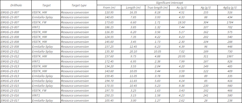 - Hole EWUG-23-007: 18.50 g/t Au & 304 g/t Ag over 1.71m;