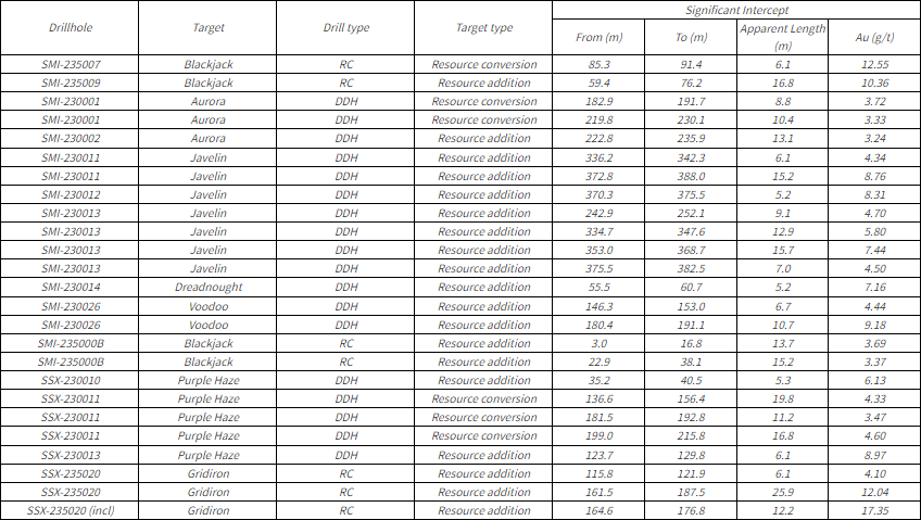 - Hole SMI-230011: 8.76 g/t Au over 15.2m