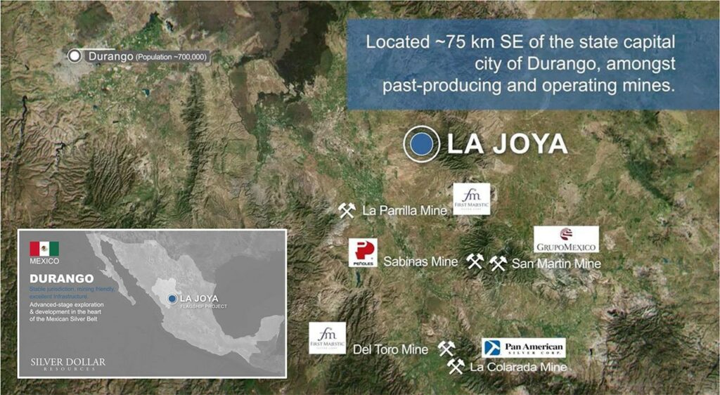 The La Joya Property is situated approximately 75 kilometres directly southeast of the state capital city of Durango in a prolific mineralized region with past-producing and operating mines including Grupo Mexico’s San Martin Mine, Industrias Penoles’s Sabinas Mine, Pan American Silver’s La Colorada Mine, and First Majestic’s La Parrilla and Del Toro Silver Mines.