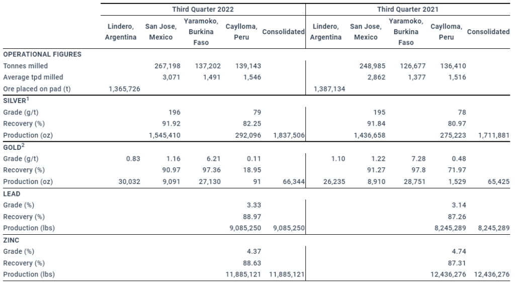 The Company’s three Latin American mines delivered another steady production quarter for all metals. Consolidated gold production for the third quarter of 2022 reflected a 6.9 percent increase when compared to the same period of 2021; on track to meet the annual guidance range. The 2022 third quarter also saw stronger silver and base metals production at the San Jose and Caylloma mines, favored by higher production and higher head grades for the period.