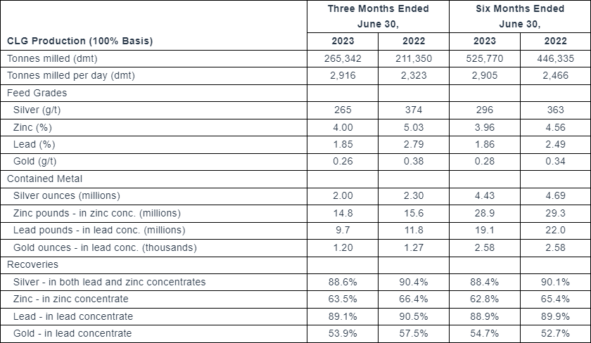 Silver production was 2.00 million ounces in the second quarter of 2023, 13% below the 2.30 million ounces in the second quarter of 2022. The reduction is mainly attributable to a 29% decline in silver grades in Q2 2023, as expected in the mine plan, and partially offset by the 26% increase in mill throughput. Zinc production decreased by 5%, lead production declined by 18%, and gold production decreased by 6%, compared with the second quarter of 2022 due to lower mill feed grades as expected in the mine plan. Recoveries for the second quarter of 2023 were marginally lower than in the comparable quarter for 2022 due to lower grades and metallurgical characteristics which can vary quarter over quarter.