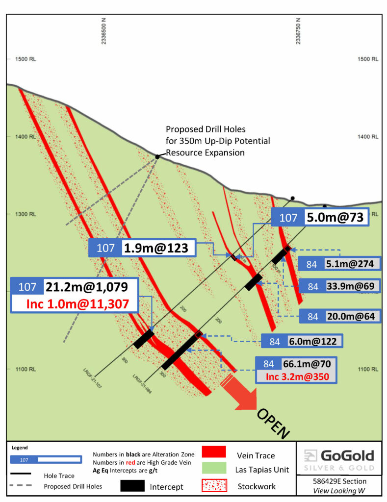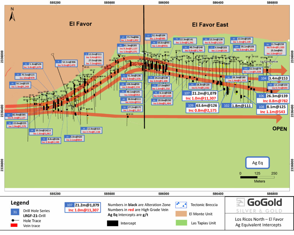Halifax, NS – GoGold Resources Inc. (TSX: GGD) (OTCQX: GLGDF) (“GoGold”, “the Company”) is pleased to release the results of 6 drill holes at El Favor East within Los Ricos North. Hole LRGF-21-107 intersected 1.0m of 11,307 g/t silver equivalent (“AgEq”) contained within 21.2m of 1,079 g/t AgEq. See Table 1 for breakdown of silver and gold values and Figure 1 for a cross section of LRGF-21-107. These drill holes represent data that is post resource cut-off date and will form part of a future resource update. The drill program at El Favor East is primarily focused on expansion of the resources with up-dip and down-dip drilling in addition to strike expansion on the zone towards the east.